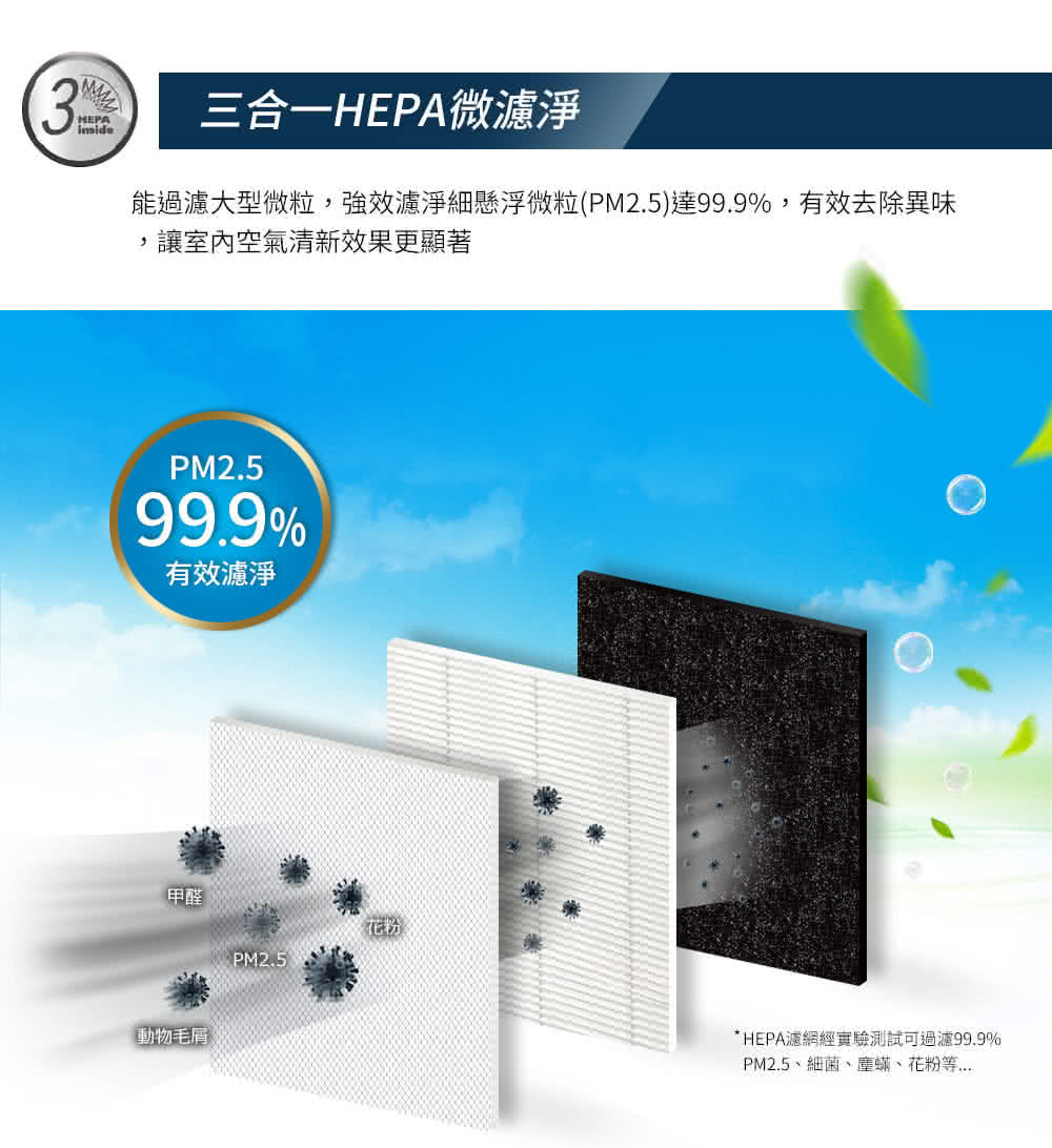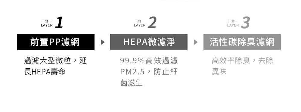 三合一濾淨(前置濾網+醫療級HEPA 13濾網+活性碳濾網),過濾PM2.5達99.9%,有效去除異味。