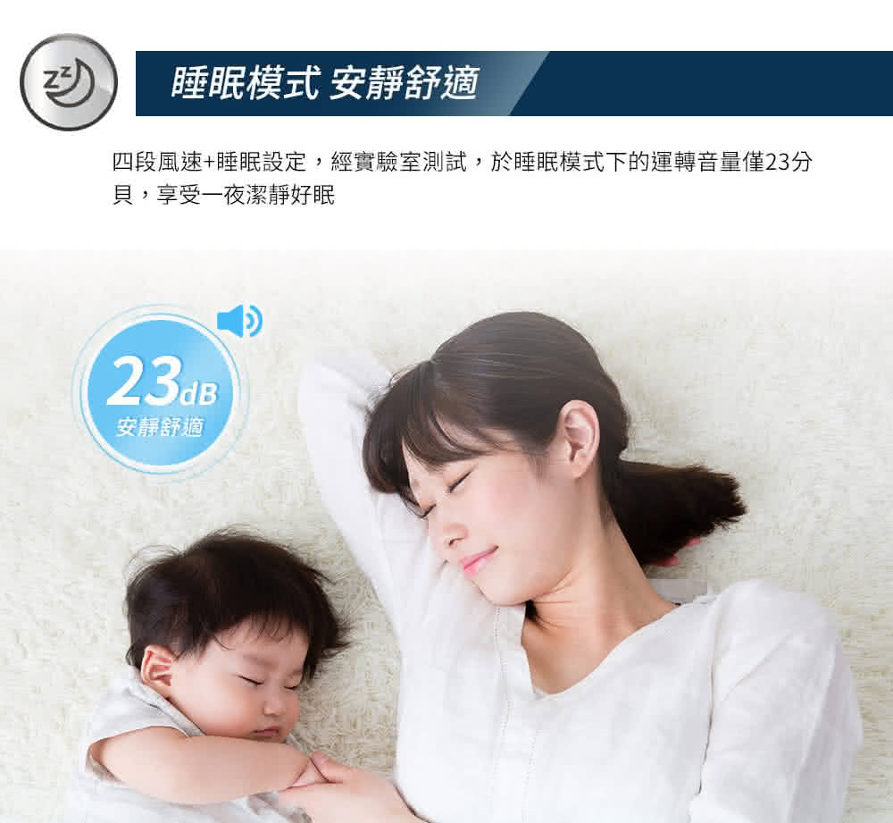 貼心低噪音睡眠模式功能,運轉音量僅23dB,讓您享受整夜安心好眠。